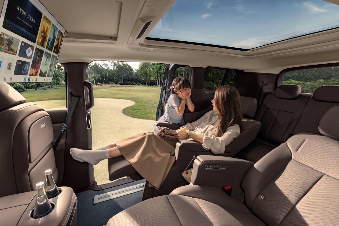 出行便捷性上,车辆配备781mm同级领先的侧滑门开口与400mm超低地台,既方便穿礼服的乘客优雅上下车,也让老人、孩童无需费力抬脚;170mm超宽中央通道,让二三排之间往返无需侧身避让,进一步提升全舱通行便利性。